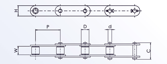 | KDV Chain No. | Pitch (P) | Roller Diameter (D) (Max.) | Width Between Inner Plates (W) (Min.) | Plate Height (H) (Max.) | Pin Diameter (d) (Max.) | Clearance (c) (Max.) | Average Weight (kg/m) | Tensile Strength kg (Min.) |