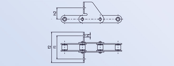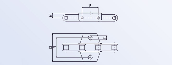 | KDV Chain No. | Pitch (P) | Transverse Pitch for Bolts (f1) | Bolt Hole Diameter (h) | Width Over Attachment (f2) | Height of bolt hole center (h2) |